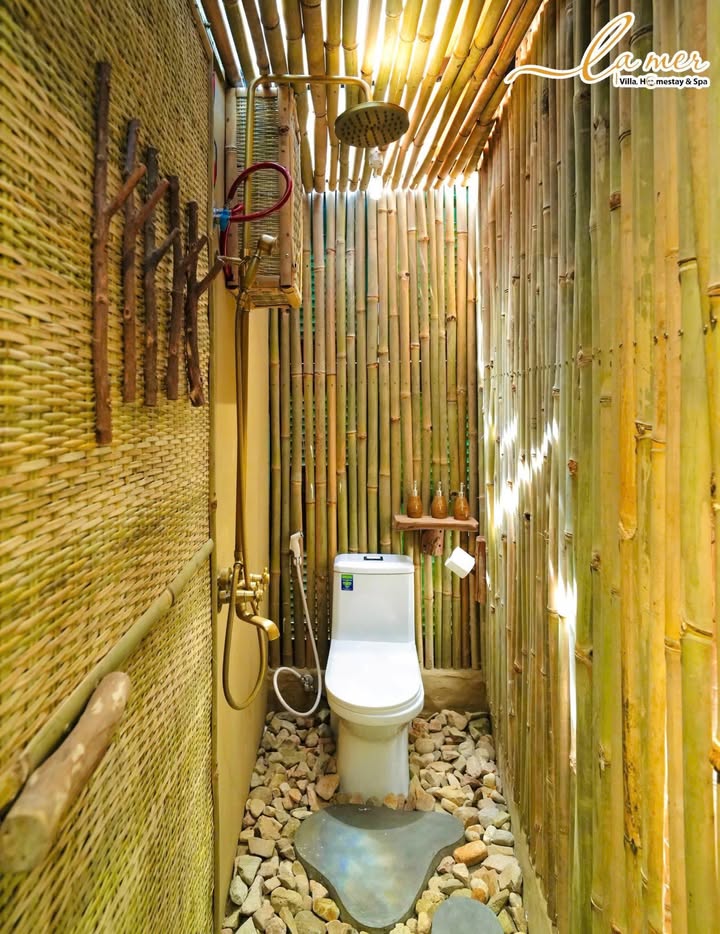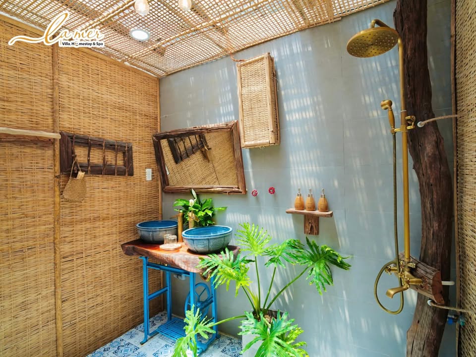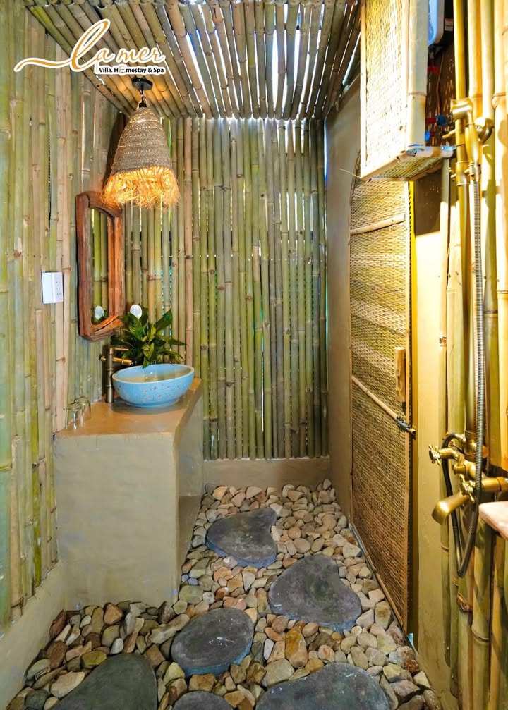 Ngắm nhìn căn villa qua hình ảnh bạn còn thấy rõ là toàn bộ căn nhà được tô điểm với tông màu xanh trắng để tạo cảm giác tươi mới. Vật dụng và trang trí trong nhà rất gần gũi khi sử dụng chất liệu tre, gỗ và lát. Không gian bên trong và bên ngoài hòa hợp, thoáng đãng với ánh sáng tự nhiên và cây xanh luôn hiện diện ở bất kỳ đâu trong ngôi nhà.